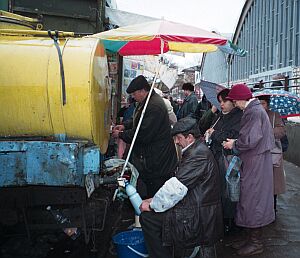|  |  |   [16-12-01] "На том берегу Днестра".Мумин Шакиров: Война в Приднестровье унесла тысячи человеческих жизней. Национальный фронт Молдовы потерпел поражение, но страна перешла с кириллицы на латиницу. Левый берег Днестра отказался говорить по-румынски и встал с оружием на защиту русского языка. Сепаратисты одержали победу и создали никем не признанную Приднестровскую Молдавскую республику. "По мере демократизации России ей станет противно исповедовать принцип, что Игорь Смирнов, конечно, сукин сын, но он - наш сукин сын". "Мы - не чеченцы, не кавказцы, здесь таких резких взрывов не бывает. Если мы - промышленная зона, грош нам цена, если мы не наладим производство вооружения. Голыми мы ходить не собираемся". "Я - сторонник мощной единоличной власти, так же как и Воронин - он царек". "Когда ввели наши деньги, мы называли их "суворики", а на правом берегу называли "приднестровики". Как говорится, пожуем - увидим, как сказали тигры, когда к ним прислали нового дрессировщика". "Я их не знаю. Вот подходит мужичок, говорит: "Вы - Том Маркович?" - "Да." - "Свали пожалуйста, иначе будет плохо"". Так почти каждый день безработный Олег Копарь добывает себе на пропитание. На Центральном рынке в Бендерах его знают многие, от местных торговцев до приезжих покупателей, от бродяг до участковых милиционеров. Людям нравится, как он поет. Крытый рынок в Бендерах - это самое оживленное и живописное место в городе. За его пределами - скучная архитектура промышленного райцентра и провинциальная бедность, а здесь, под куполом торгового зала - богатство красок, запахов, широкий ассортимент "сырого и вареного" и знакомая кулинарная лексика. Здесь продавцы - психологи, чужих опознают сразу: и по говору, и по внешнему виду, и по праздному любопытству. Человека из России вычисляют быстро, и им есть что сказать заезжему гостю. "Много денег, и бандитов много. Здесь денег нет, и бандитов нема". "Было мясо, ели щи, были все товарищи, появились господа - и исчезла вся еда. В Москве, конечно, веют метели, вам легче, вы там не в тюрьме. У вас пуховые постели, живете вы всегда в тепле. Живете вы всегда в достатке, не ощущаете тоску, а мне приходится несладко жевать вонючую треску. Сейчас треска дорогая". Цены на рынке в полтора раза ниже, чем в Москве. Но для тех, кто получает 50 долларов в месяц (такова средняя зарплата в Приднестровье), кусаются. Но понятно, что люди здесь не живут на одну получку: где-то подрабатывают, где-то подворовывают, где-то экономят. Одних кормит челночный бизнес, других - земля, благо климат в Молдавии мягкий.
