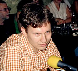 Лев Пирогов: А я против того, чтобы мы тут выбрали конвенциональным термином "саппортеры", потому что мне нравится русское слово "болельщики". Античные греки считали, что любовь, вдохновение и любая страсть, подобная болезни, овладевают человеком, и он перестает принадлежать себе, а на "саппортерах" воду возят. А по поводу вашего вопроса... скажем, четыре года назад Россия переживала пик увлеченности политкорректностью, собственной, страстно обретаемой буржуазностью. И на эти пять мячей, которые там скатывались откуда-то с разных концов Парижа к центру, к церемонии открытия, мы смотрели со слезой умиления, как на залог вот той самой всемирной глобальной деревни, к которой и все тоже скоро будем принадлежать усилиями московского журнала "Столица", благодаря черномырдинской стабилизации и всем таким хорошим делам. Буквально через месяц пик был достигнут, выше можно было только падать. И как знать, вот сейчас находимся ли мы на пике нашего отторжения и политкорректности, и буржуазности, и глобализации и так далее. По поводу депрессии, переживаемой после 11 сентября, как вы сказали, я заметил следующее: во время трансляции матча этого чемпионата почему-то звуковой сигнал несколько опережал визуальный. Таким образом, комментатор начинал кричать "гол" где-то за секунду или за полсекунды до того, как это случалось. У меня с моими товарищами - мрачными антиглобалистами и конспирологами родилась идея, что все на самом деле заранее было просчитано, был написан подробный сценарий чемпионата, и просто распечатки этих сценариев раздали комментаторам, и они его зачитывали, и некоторые не очень профессионально синхронизировались с работой актеров на поле. Мы даже выдвинули теорию, что в финальном матче сборная США со счетом 4:3 должна победить объединенную сборную Саудовской Аравии и оси зла. К сожалению, не получилось. Но другая интрига возникла, не менее любопытная - с Южной Кореей и т.д.