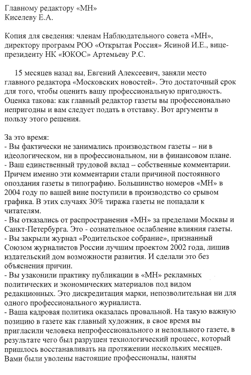 Михаил Соколов: Это письмо главному редактору Евгению Киселеву и членам наблюдательного совета Ирине Ясиной и господину Артемьеву, вице-президенту компании ЮКОС.