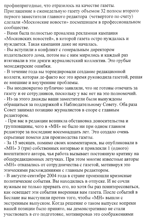 Да, действительно, я недавно был назначен генеральным директором с соответствующими полномочиями. До этого я был только главным редактором, и не имел ни административных, ни финансовых, ни многих других полномочий, которые были сосредоточены в Издательском доме. Сейчас я стал, если угодно, един в двух лицах. В этой связи возникла совершенно новая ситуация. По сути дела, вся ответственность за будущее газеты легла на мои плечи. И исходя из этой ответственности, которую я согласился принять, я после достаточно долгого, поверьте, это было долгое и трудное размышление, я принял решение сделать определенные кадровые изменения в составе редакции. Поверьте, кадровые решения, особенно когда с кем-то расстаешься, это очень тяжело. И решение было очень непростым. Но я считаю, что газета для того, чтобы жить дальше, развиваться, завоевывать новых читателей, должна измениться, в том числе, и в кадровом отношении, должна быть влита новая кровь.