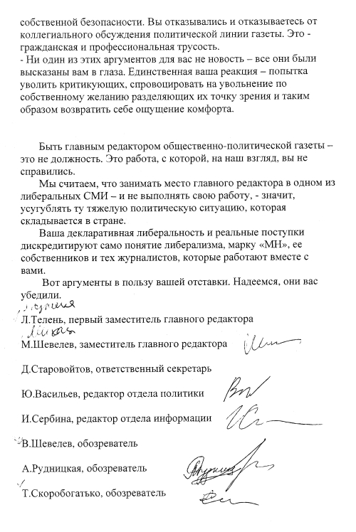 Мы, нижеподписавшиеся, заявляем об отказе от сотрудничества с главным редактором газеты "Московские новости" Евгением Киселевым в качестве главного редактора.